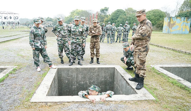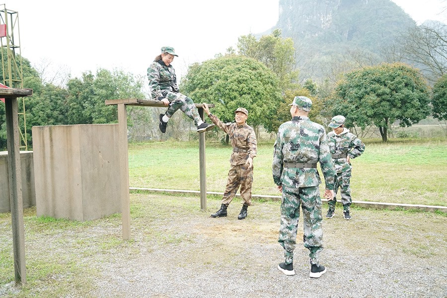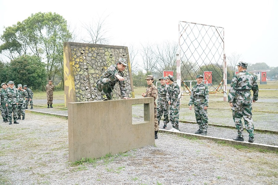 “敬禮、立正、稍息、跨立、停止間轉(zhuǎn)法!”嘹亮的軍事訓(xùn)練口號(hào)在操場(chǎng)上響起。天空飄著細(xì)雨,但沒有一人叫苦叫累,大家仔細(xì)聽教官對(duì)每個(gè)動(dòng)作的分解講解,認(rèn)真領(lǐng)會(huì)并糾正動(dòng)作,每一個(gè)動(dòng)作都力爭(zhēng)規(guī)范標(biāo)準(zhǔn)。400米障礙軍事技能場(chǎng)上,教官展示完后,大家都不甘示弱,分組嘗試完成跨樁、深坑、矮墻、高板跳臺(tái)、云梯、獨(dú)木橋、高墻、低樁網(wǎng)單等項(xiàng)目。中午訓(xùn)練結(jié)束后,大家在教官的帶領(lǐng)下進(jìn)行了飯前一首歌的拉歌準(zhǔn)備。大家嚴(yán)格按用餐紀(jì)律,等候不說話、打飯按順序、餐后自己洗碗。飯后,大家用半小時(shí)參觀了基地內(nèi)務(wù),然后又進(jìn)入緊張的訓(xùn)練中。