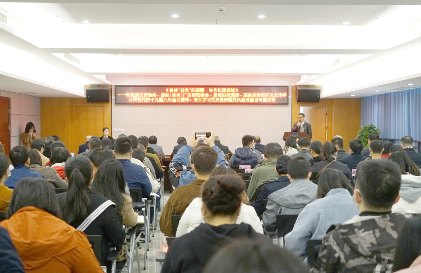 為深入貫徹落實(shí)全面從嚴(yán)治黨要求,進(jìn)一步推進(jìn)黨風(fēng)廉政建設(shè)和反腐敗工作深入開展,增強(qiáng)黨員干部廉潔自律意識(shí)和拒腐防變能力,11月25日,市紀(jì)委監(jiān)察委駐臨桂新區(qū)管委會(huì)紀(jì)檢監(jiān)察組組長、臨桂新區(qū)黨工委委員石安蘭在新城投資集團(tuán)十樓會(huì)議室開展綜合監(jiān)督單位集體廉政談話暨《保持“趕考”的清醒 守住紀(jì)律底線》專題黨課。市紀(jì)委監(jiān)察委駐臨桂新區(qū)管委會(huì)紀(jì)檢監(jiān)察組副組長唐良平主持專題黨課。臨桂新區(qū)管委會(huì)、高鐵(桂林)廣西園管委會(huì)、新城投資集團(tuán)、高鐵園投資公司等4家單位120多名黨員干部聆聽了黨課。