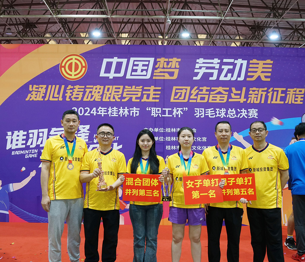4月27日下午,由市總工會(huì)主辦的“中國(guó)夢(mèng) 勞動(dòng)美 凝心鑄魂跟黨走 團(tuán)結(jié)奮進(jìn)新征程”桂林市“職工杯”羽毛球比賽圓滿結(jié)束并舉行了頒獎(jiǎng)儀式。新城投集團(tuán)羽毛球隊(duì)經(jīng)過(guò)激烈角逐,在36支參賽隊(duì)伍中摘得多項(xiàng)榮譽(yù):由公司黨委副書(shū)記(主持工作)、副董事長(zhǎng)、總經(jīng)理朱毅擔(dān)任領(lǐng)隊(duì),吳萍明、龔志祥、楊衛(wèi)來(lái)、張欣婭、唐蒙組成的新城投集團(tuán)“黨旗映勝地”羽毛球隊(duì)榮獲團(tuán)體第三名;張欣婭榮獲女子單打第一名;楊衛(wèi)來(lái)榮獲男子單打第五名的優(yōu)異成績(jī)。