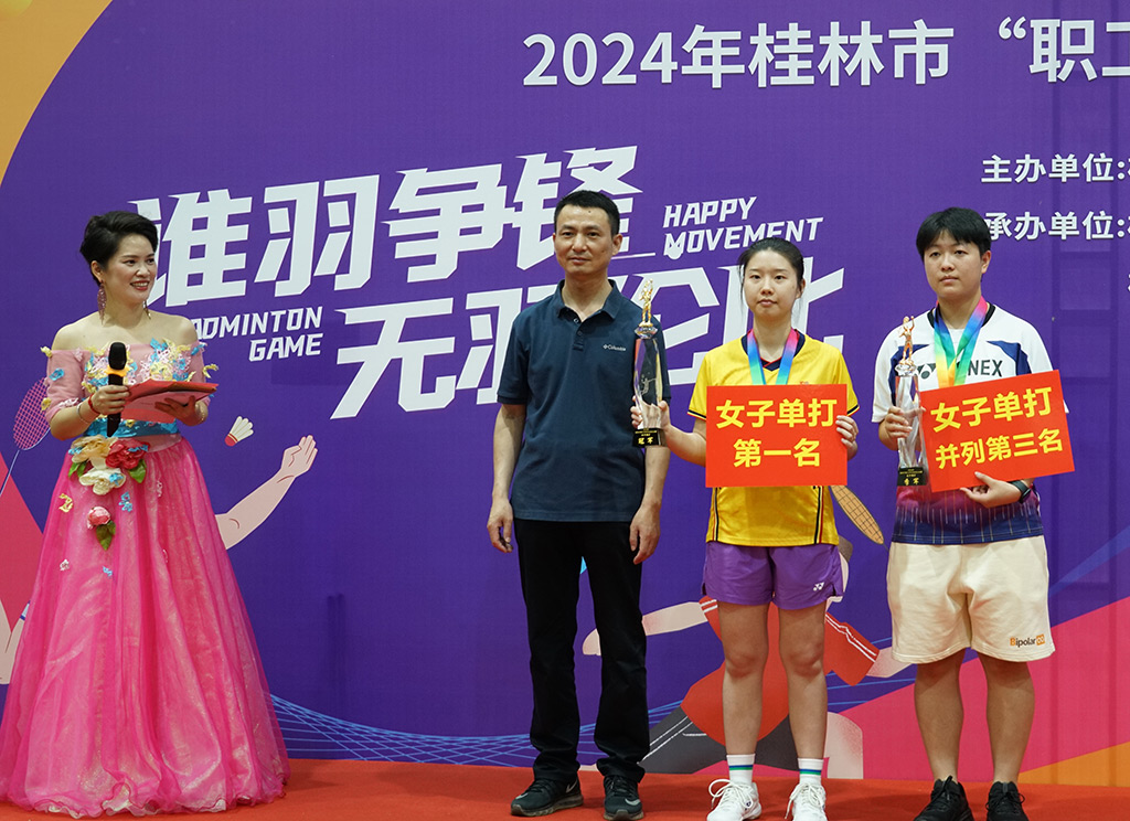 新科女單冠軍張欣婭,1999年6月出生于桂林,2021年7月入職桂林新城投資開(kāi)發(fā)集團(tuán)有限公司下屬子公司桂林宏謀物業(yè)服務(wù)股份有限公司,10歲開(kāi)始學(xué)習(xí)羽毛球,在良師益友肖教練的悉心教導(dǎo)下,水平不斷提高,曾在高中時(shí)期獲得桂林市女子單打第四名。進(jìn)入大學(xué)后,她擔(dān)任校羽毛球隊(duì)女隊(duì)隊(duì)長(zhǎng),代表學(xué)校參加過(guò)全國(guó)、省級(jí)、市級(jí)大型羽毛球比賽,取得全區(qū)第十二屆學(xué)生運(yùn)動(dòng)會(huì)羽毛球比賽普通本科女子單打組第五名,桂林市十大高校羽毛球比賽女子團(tuán)體第二名,第十屆“全區(qū)高校職工羽毛球”比賽優(yōu)秀裁判員等榮譽(yù)。入職宏謀物業(yè)公司以后,她仍堅(jiān)持利用業(yè)余時(shí)間練習(xí)羽毛球,既提高了身體的靈活性和協(xié)調(diào)性,增強(qiáng)了專注力、判斷力和反應(yīng)能力,又增進(jìn)了同事間的友誼和團(tuán)隊(duì)凝聚力,有利于更好地應(yīng)對(duì)挑戰(zhàn),以飽滿的熱情投入到各項(xiàng)工作中。