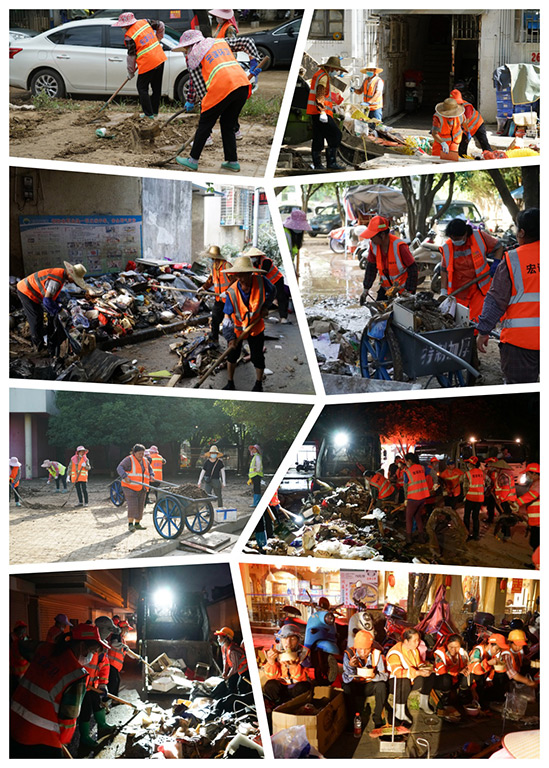 在龍船坪小區(qū)、安新小區(qū)、寧遠(yuǎn)小學(xué)及周邊街道,一群身著橘紅色馬甲、印有“宏謀環(huán)衛(wèi)”的環(huán)衛(wèi)工人成為了救災(zāi)現(xiàn)場(chǎng)的一道亮麗風(fēng)景線。他們不畏艱難,深一腳淺一腳地踩在垃圾堆和泥漿中,一鍬一鍬地清理垃圾和淤泥?,F(xiàn)場(chǎng)工作人員齊心協(xié)力,面對(duì)困難毫不退縮,甚至唱起了《團(tuán)結(jié)就是力量》來(lái)鼓舞士氣。經(jīng)過(guò)晝夜奮戰(zhàn),他們終于將小區(qū)道路上的垃圾清運(yùn)完畢,有效保障了道路的正常通行和居民的出行安全,及時(shí)防止災(zāi)后疫情的發(fā)生。