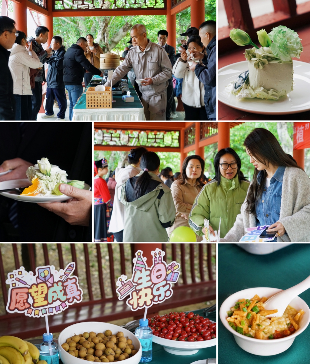 在茶歇環(huán)節(jié)中,弘毅亭長廊早已擺放著各種精美的點心、水果、飲品,以及桂林傳統(tǒng)非遺“Chinese Coffee”——油茶體驗區(qū)。油茶香氣四溢,搭配著甜蜜的蛋糕和繽紛的茶點飲料,讓這場集體生日會充滿了溫馨與甜蜜。大家圍在一起,品嘗美食,交流心得,歡聲笑語不斷,情誼也在這一刻悄然升溫。隨后,所有人品嘗了由宏謀酒管公司精心制作的生日蛋糕,一同共唱生日歡歌。