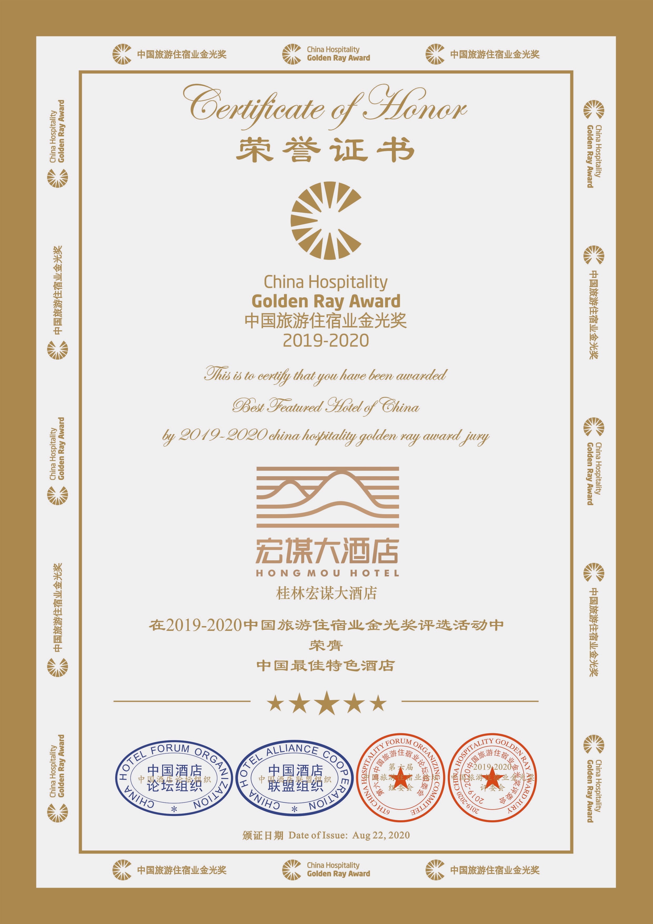 金光獎是中國旅游住宿行業(yè)跨業(yè)界、跨年度、覆蓋面最廣的獎項,獲獎評選經過各學術、專業(yè)、跨界領域評委根據各酒店競爭力、住房率、收益利潤等多個標準評選而出。桂林宏謀大酒店此次榮獲中國酒店金光獎的兩項殊榮,是對酒店不斷深化文化藝術主題,追求酒店優(yōu)秀服務品質的認可!
