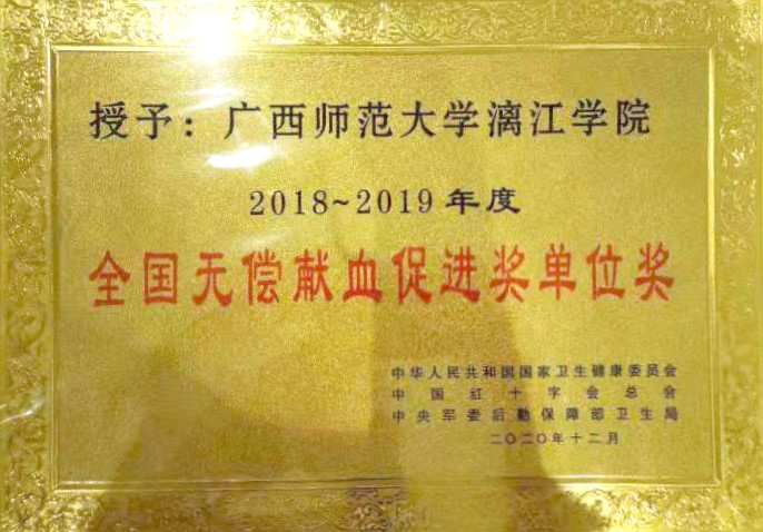 6月9日,由桂林市獻(xiàn)血委員會(huì)、桂林市衛(wèi)生健康委員會(huì)、桂林市紅十字會(huì)、中國(guó)人民解放軍聯(lián)勤保障部隊(duì)桂林聯(lián)勤保障中心衛(wèi)勤處主辦,桂林市中心血站、廣西師范大學(xué)漓江學(xué)院承辦的“喜迎建黨100周年桂林市慶祝2021年世界獻(xiàn)血者日無(wú)償獻(xiàn)血表彰文藝匯演”活動(dòng)在漓江學(xué)院召開。漓江學(xué)院獲得全場(chǎng)唯一“全國(guó)無(wú)償獻(xiàn)血促進(jìn)獎(jiǎng)單位獎(jiǎng)”。