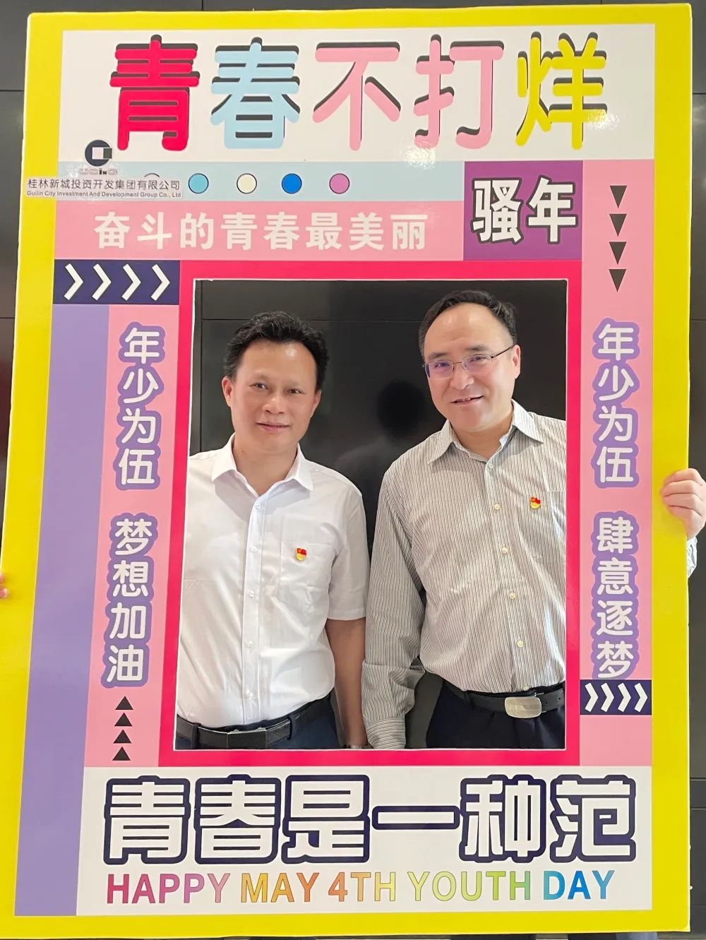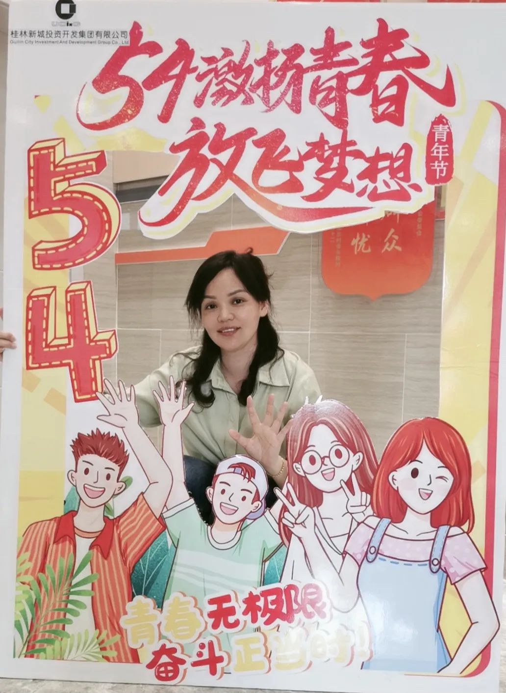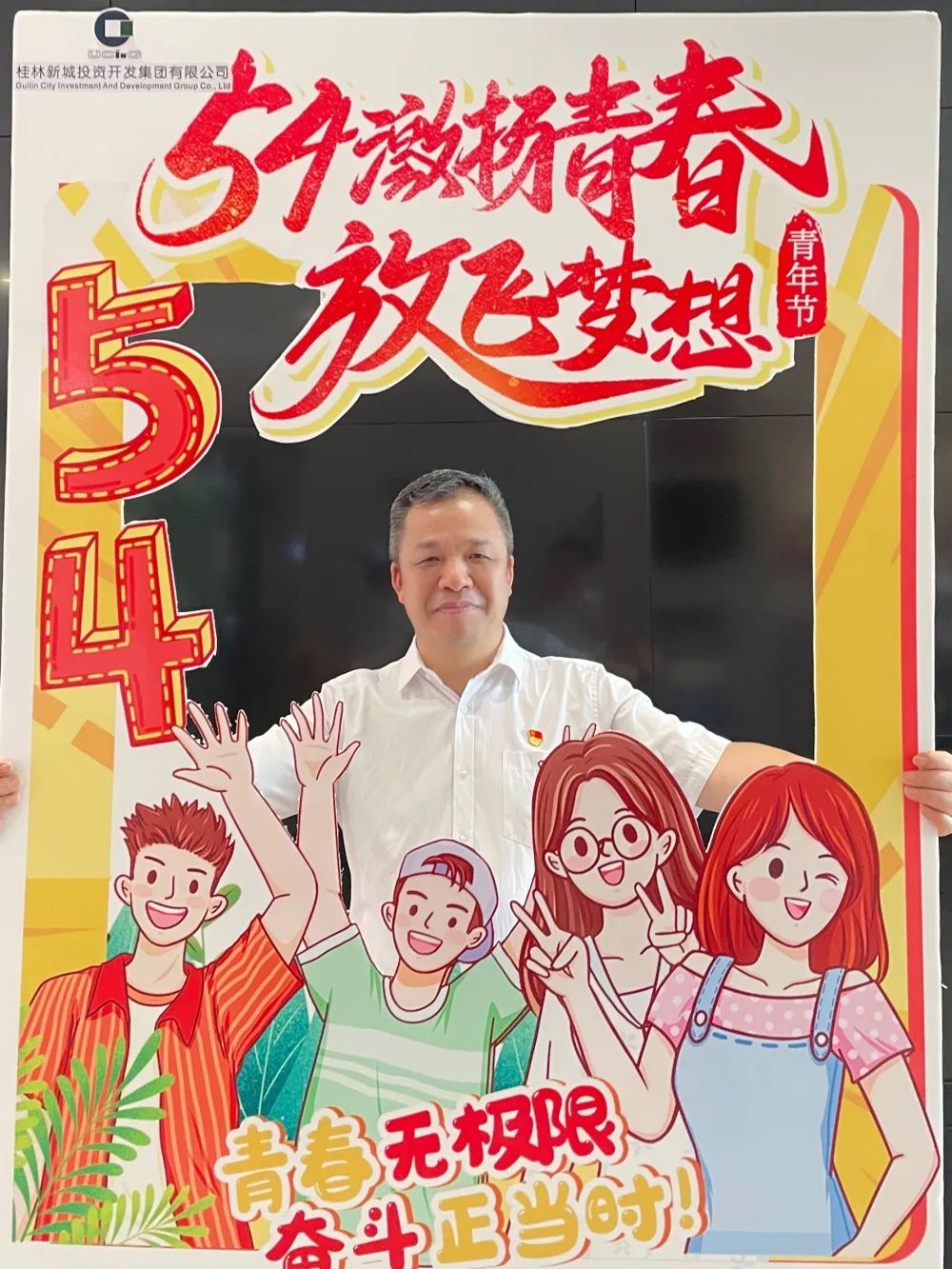 公司一樓大廳,團(tuán)支部布置了“五四主題”畫框打卡活動,熱烈慶祝五四青年節(jié)到來。周道林帶頭打卡,并鼓勵全體員工積極參與拍照打卡活動,渲染喜慶的節(jié)日氛圍。