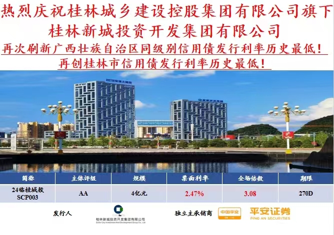 5月31日,桂林城鄉(xiāng)建設(shè)控股集團(tuán)有限公司旗下桂林新城投資開發(fā)集團(tuán)有限公司成功發(fā)行2024年度第三期超短期融資券,募集規(guī)模4億元,期限270天,票面利率2.47%,全場(chǎng)倍數(shù)3.08倍,由平安證券為獨(dú)立主承銷商。本期債券是新城投集團(tuán)年內(nèi)第三次刷新廣西壯族自治區(qū)同主體評(píng)級(jí)超短期融資券票面利率最低記錄,同時(shí)也是桂林市信用債發(fā)行利率歷史最低!