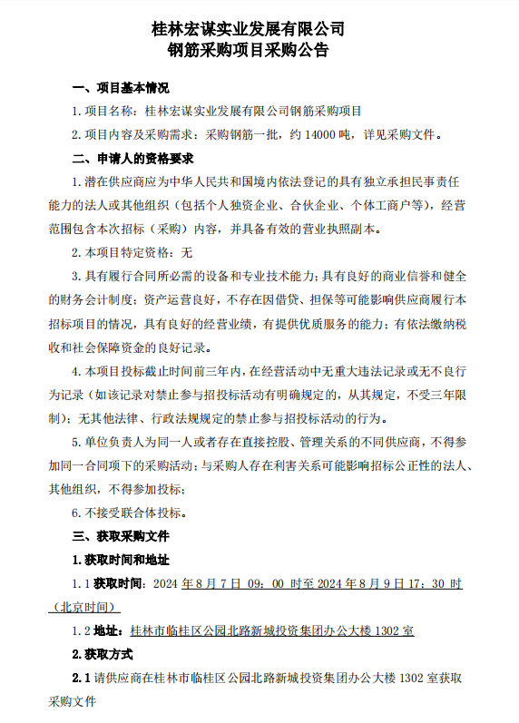 桂林宏謀實(shí)業(yè)發(fā)展有限公司鋼筋采購項(xiàng)目采購公告