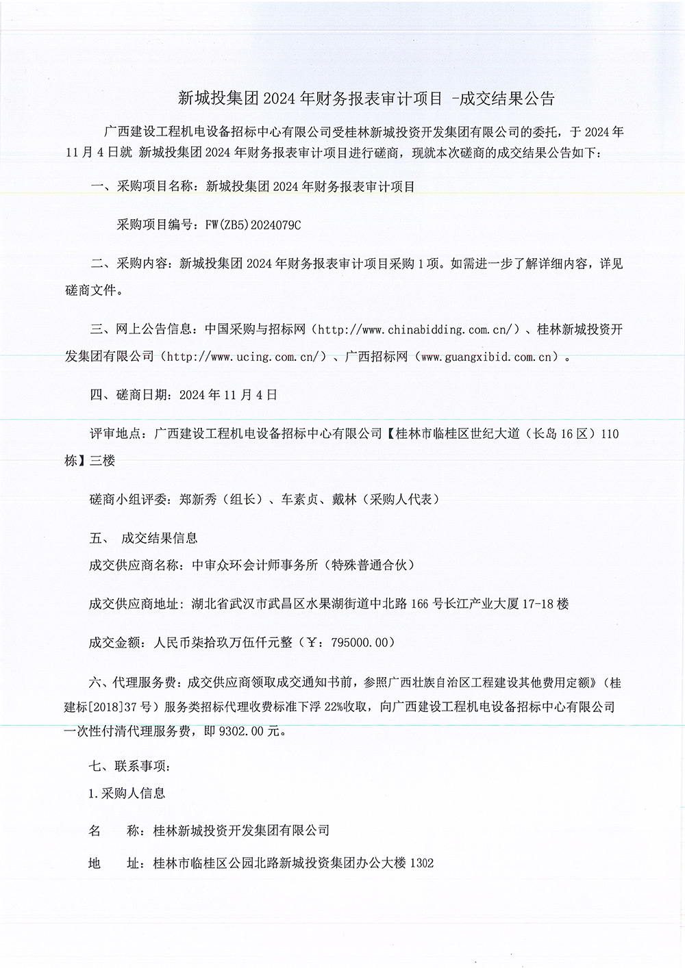 新城投集團(tuán)2024年財(cái)務(wù)報(bào)表審計(jì)項(xiàng)目【FW(ZB5)2024079C】成交結(jié)果公告