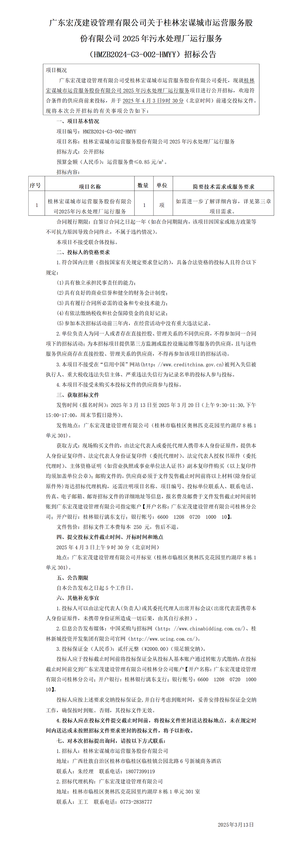 廣東宏茂建設管理有限公司關于桂林宏謀城市運營服務股份有限公司2025年污水處理廠運行服務(HMZB2024-G3-002-HMYY)招標公告